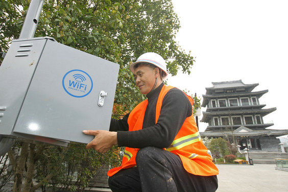 继金阳客车站率先开通贵阳全域免费WiFi后,贵阳孔学堂于3月30日也开始开展该项目的试点。图为工人正在安装免费WiFi设备箱。