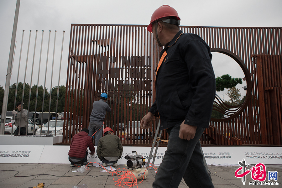 11月30日,西栅景区入口处,工作人员正在安装“第四届世界互联网大会”标识物。 中国网记者 张若梦 摄