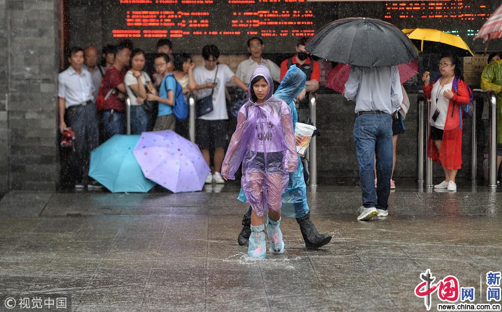 2018年7月17日,北京持续强降雨天气,多地路面积水,市民出行“全副武装”。