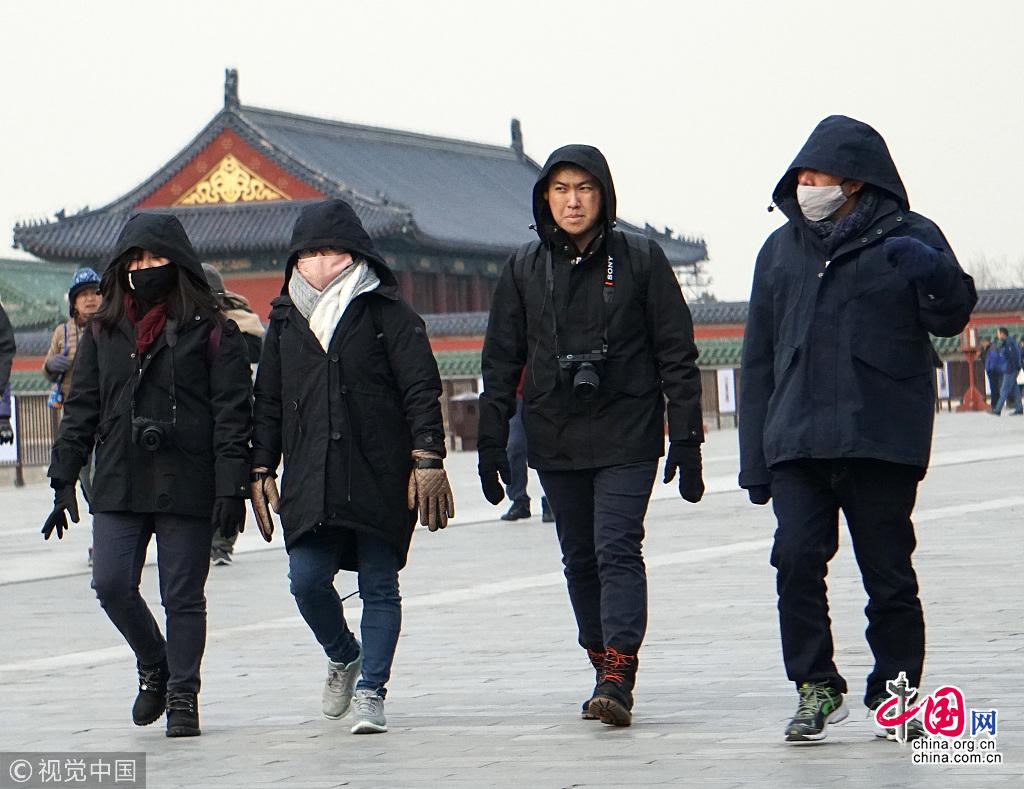 2018年12月5日,北京气温继续走低,游客包裹严实地在寒风中游览天坛公园,热情不减。当天北京最高气温跌至1℃,寒意十足。杜佳/视觉中国