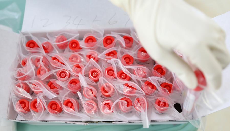 1月5日,在沈阳市皇姑区淮河街一处核酸检测点,医务人员将核酸检测样本封袋装入盒中。