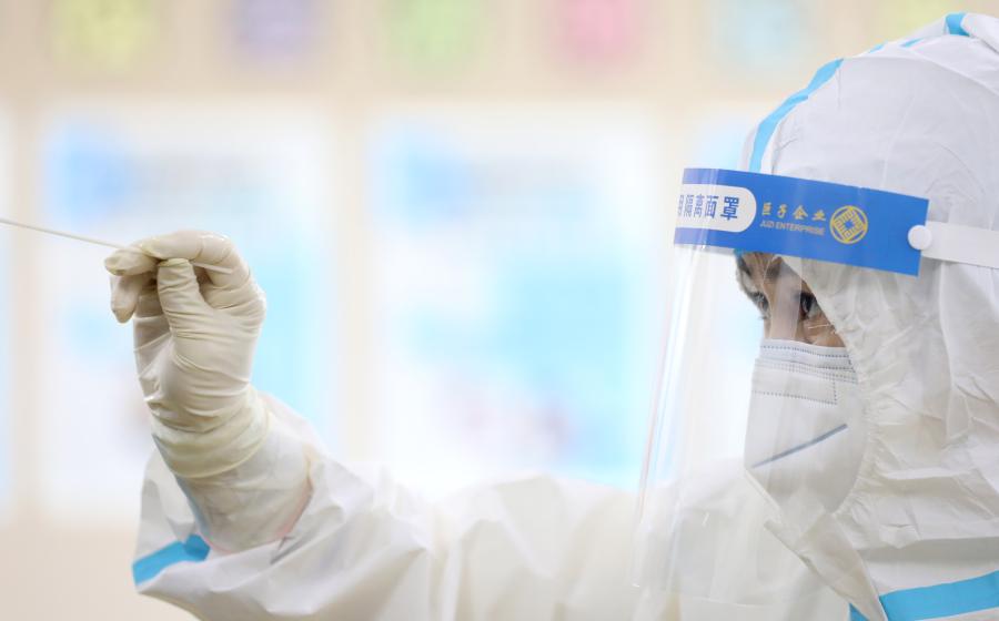 1月5日,在沈阳市铁西区小北一路一处核酸检测点,一名医务人员为居民进行核酸检测。