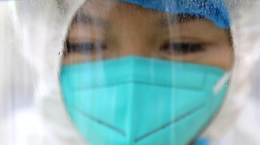 1月5日,在沈阳市铁西区小北一路一处核酸检测点,一名医务人员的面罩内充满了水雾。
