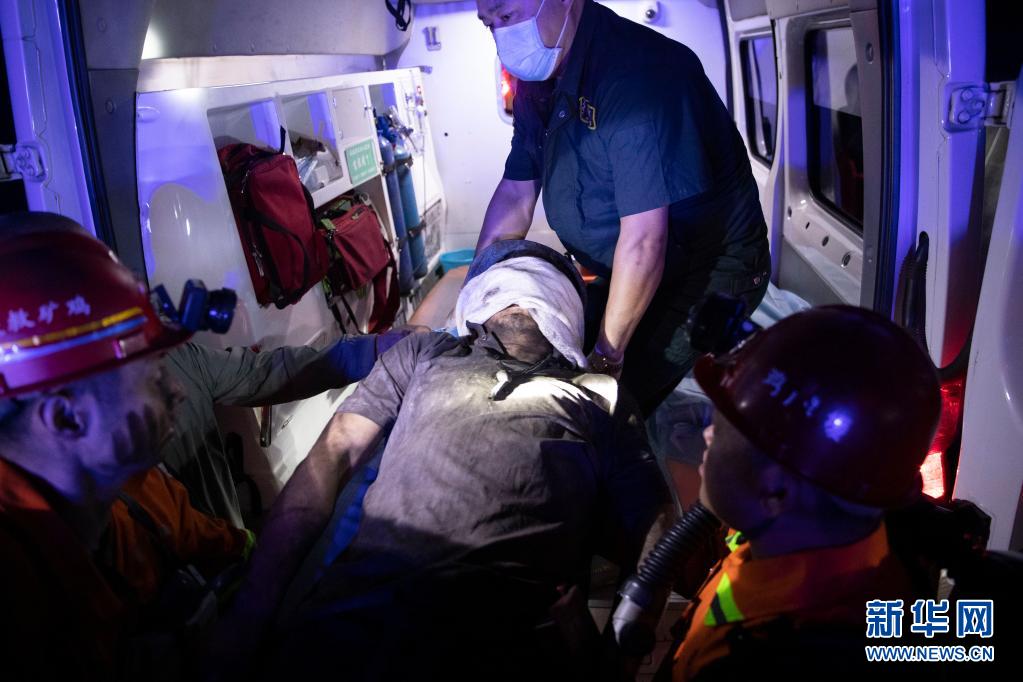 6月6日,在黑龙江龙煤矿业集团鸡西矿业公司滴道盛和煤矿立井事故现场,救援人员将获救矿工送上救护车。新华社记者 张涛 摄