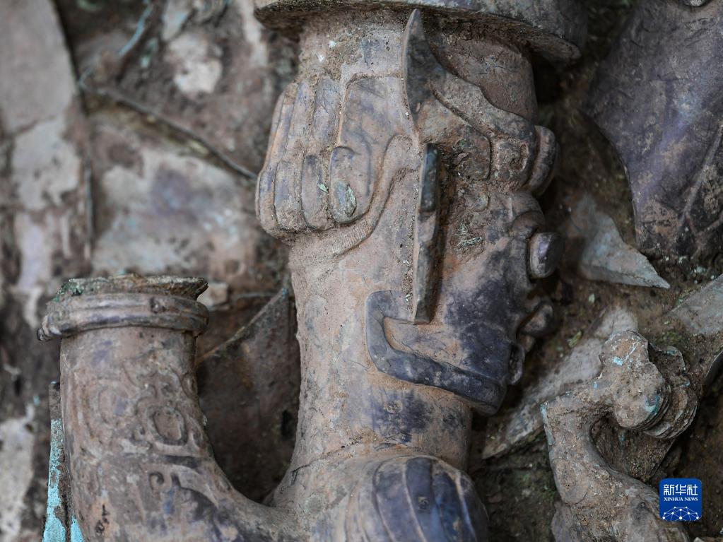 这是在三星堆遗址8号“祭祀坑”拍摄的铜人像(6月1日摄)。新华社记者 王曦 摄