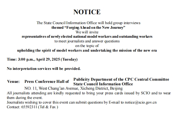 国务院新闻办公室将于2025年4月29日(星期二)下午3时举行“新征程上的奋斗者”中外记者见面会,请新当选全国劳动模范和先进工作者代表(名单附后)围绕“弘扬劳模精神 勇担时代使命”与中外记者见面交流。欢迎出席。